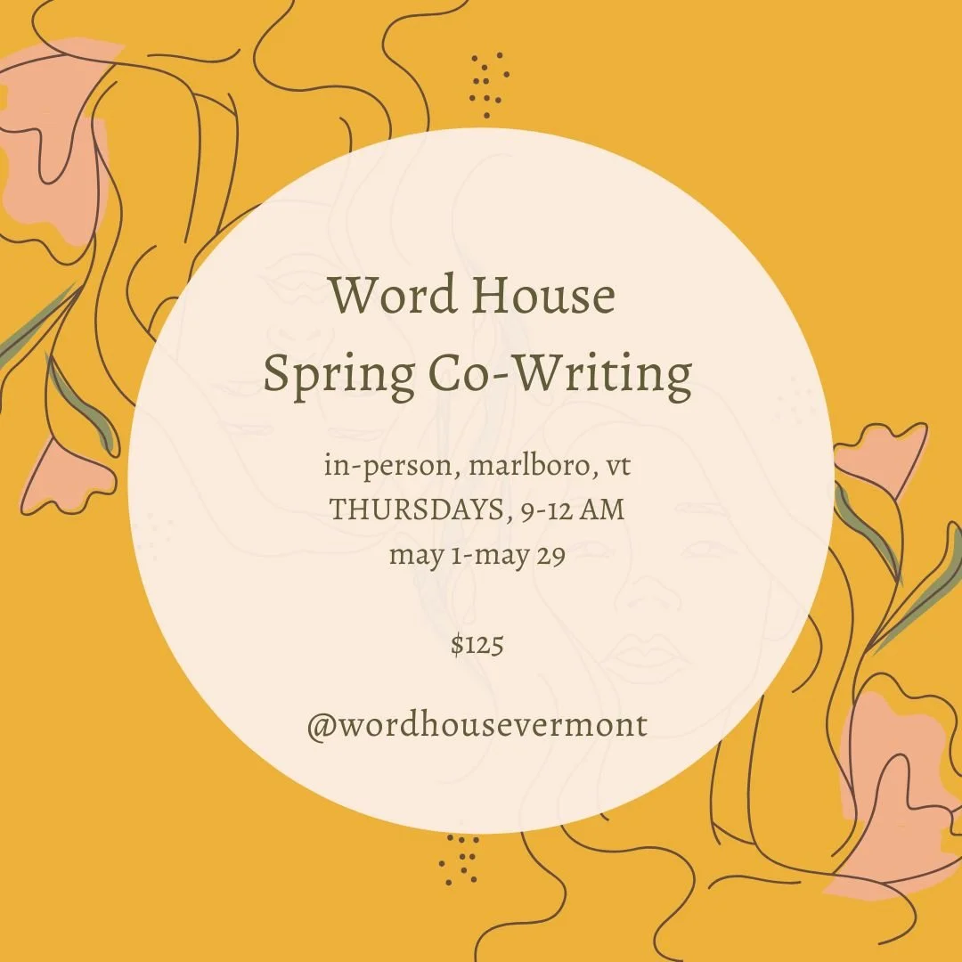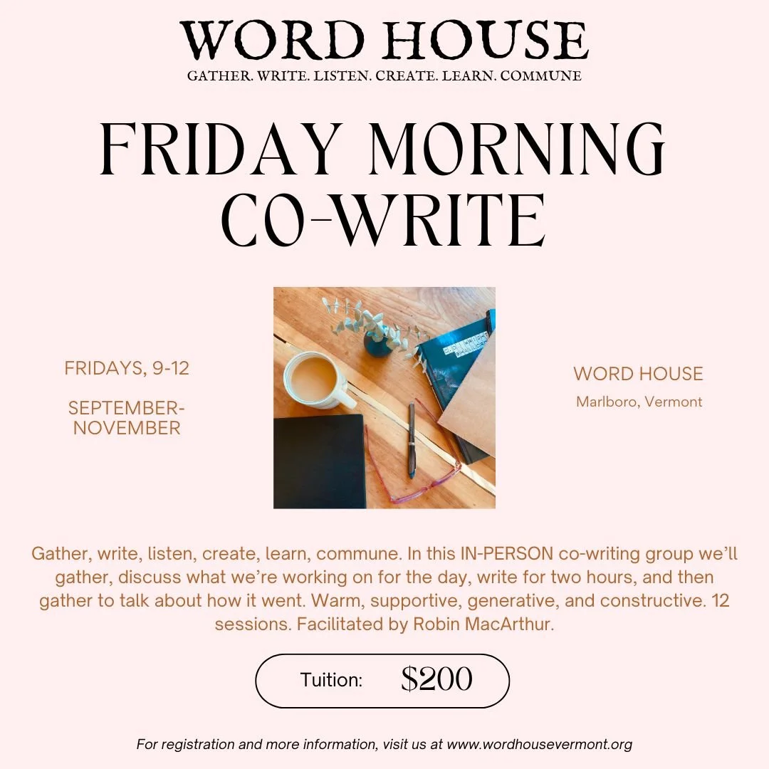 Friday morning, in-person co-writing at Word House! We’ll gather from 9-12 on Friday mornings to: